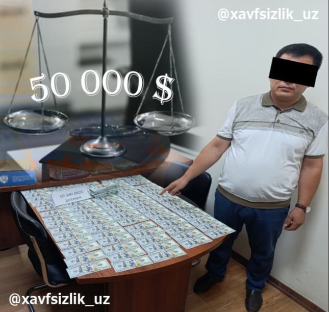 ДХХ ва Прокуратура ходимлари ҳамкорлигида ўтказилган тезкор тадбирда адвокат сўралган пул маблағидан 50 000 АҚШ долларини олган вақтида ашёвий далиллар билан ушланди.