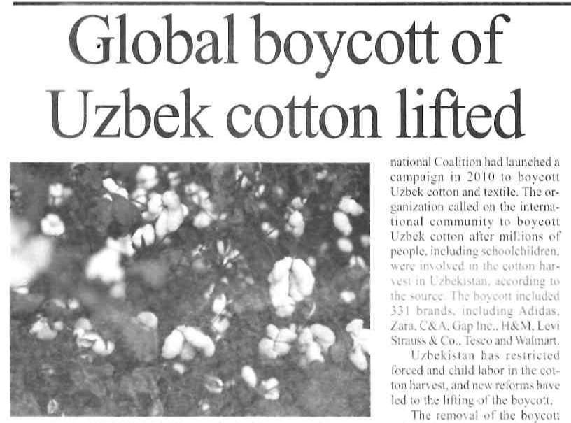 Унда, жумладан, “яқинда “Cotton Campaign” халқаро коалицияси раҳбари Беннет Фриман раҳбарлигидаги делегация Ўзбекистонга ташриф буюриб, ўзбек пахтаси ва тўқимачилик саноати маҳсулотларига нисбатан жорий этилган бойкот олиб ташланганини билдирди”, деб ёзади «The Kabul Times».