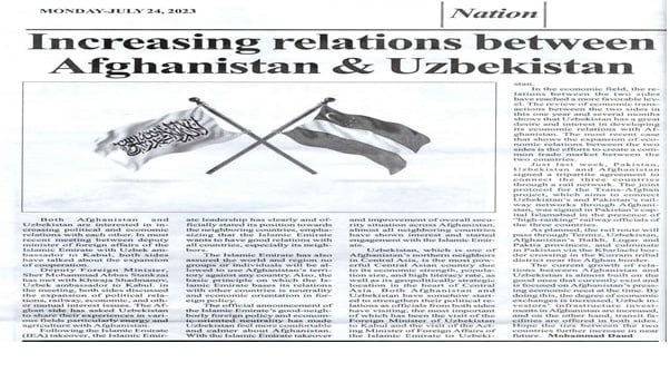 Афғонистон газетасида босилган мақолада, шунингдек, иқтисодий соҳада икки давлат ўртасидаги ҳамкорлик алоқалари юқори даражага чиққани маълум қилинган. Томонлар ўртасидаги савдо-иқтисодий алоқаларнинг сўнгги бир йил ва охирги бир неча ой давомидаги ҳолатининг таҳлили Ўзбекистон томонининг Афғонистон билан алоқларни янада ривожлантиришга интилаётганидан далолат беради. Яъни, икки томон ўртасида иқтисодий алоқалар кенгайиб бормоқда ва чегара зонасида муштарак бозор яратиш бўйича саъй-ҳаракатлар давом эттирилмоқда.