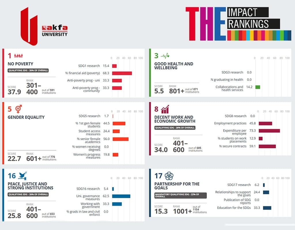 Таъкидлаш керакки, AКФA Университети 17 та БРМдан олтитасида иштирок этди: Қашшоқликнинг барча турларини тугатиш: 591 ОТМ орасида 301-400 ўрин, Соғлом ҳаёт ва фаровонликни таъминлаш: 871 ОТМ орасида 801+ ўрин, Гендер тенглик: 776 ОТМ орасида 601+ ўрин, Самарали бандликни ошириш ҳамда эркаклар ва хотин-қизларни муносиб иш билан таъминлаш асосида барқарор ва умумқамровли иқтисодий ўсишга кўмаклашиш: 685 ОТМ орасида 401-600 ўрин, Барқарор ривожланиш мақсадлари йўлида тинчликсевар ва очиқ жамиятлар барпо этилишига кўмаклашиш, барча учун одил судлов имкониятидан фойдаланишни таъминлаш ва барча даражаларда самарали, ҳисобдор ва кенг иштирокка асосланган муассасаларни ташкил этиш: 653 ОТМ орасида 401-600 ўрин, Барқарор ривожланиш мақсадларида Глобал шериклик доирасида амалга ошириш воситаларини мустаҳкамлаш ва ишларни фаоллаштириш: 1154 ОТМ орасида 1001+ ўрин.