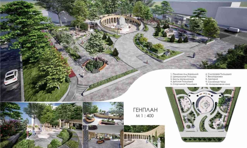 Концепцияда нафақат Ал-Хоразмийнинг меросини ва математикани оммалаштиришга, балки анъаналар билан замонавий тенденциялар ва технологияларнинг уйғунлашувига ҳам урғу берилган. Ландшафт дизайнида майдон ҳудудидаги дарахтларни ҳамда ўзига хос хусусиятларини сақлаб қолиш назарда тутилган. Спорт ва болалар майдончаларини, амфитеатр ва томошабинлар учун, интерфаол ва маъруза учун ҳудудларни барпо этиш режалаштирилган.