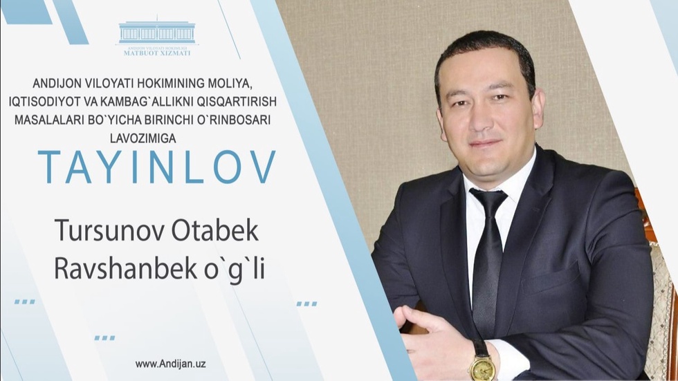 Андижон вилояти ҳокимлиги Турсунов Отабек Равшанбек ўғлини янги лавозимга тайинлангани билан табриклаб, фаолиятида улкан муваффақиятлар ва зафарлар тилаб қолади.