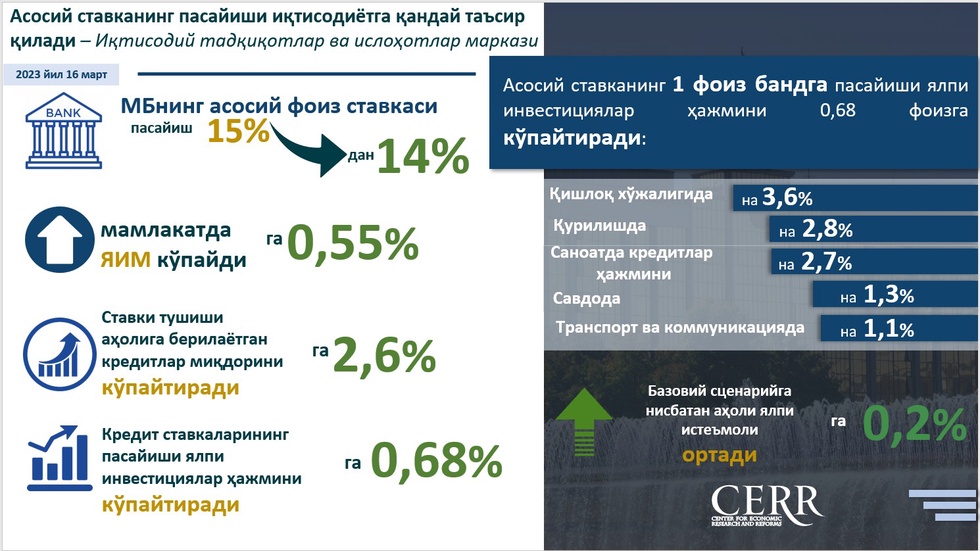 Иқтисодий тадқиқотлар ва ислоҳотлар маркази асосий ставканинг 1 фоиз бандга туширилиши макроиқтисодий кўрсаткичларга қандай таъсир қилишини таҳлил қилди. Ҳисоб-китобларга кўра, иқтисодиётнинг жадаллашиши, аҳоли истеъмоли ошиши, кредит ҳажми ўсиши кутилмоқда.
