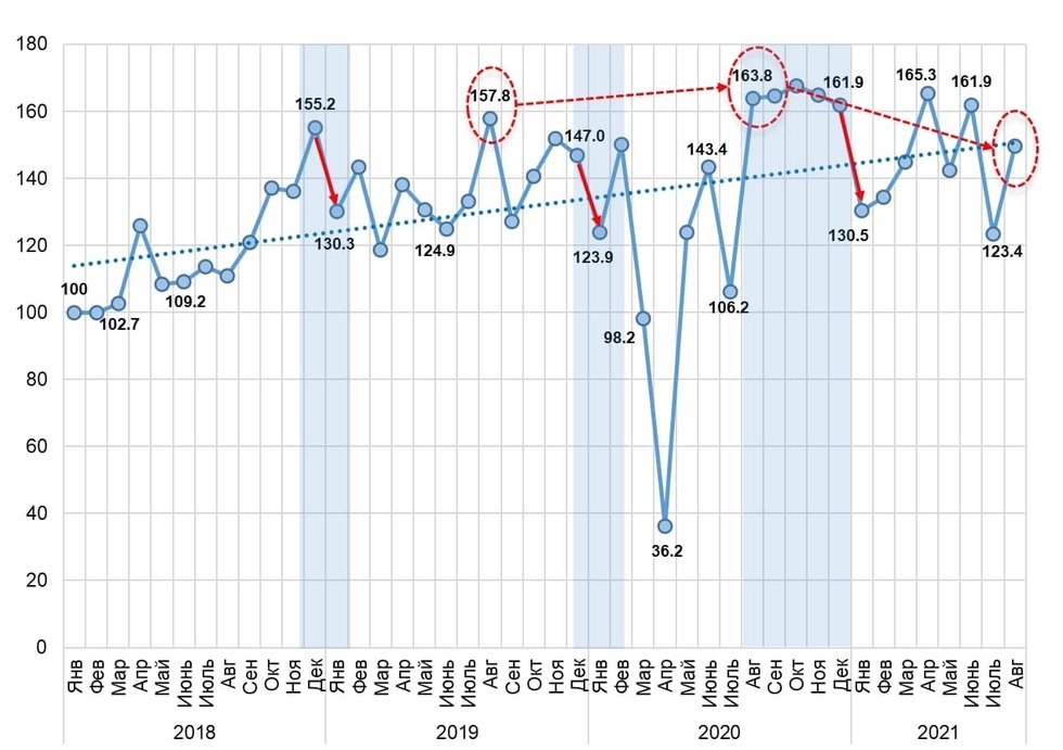 Лекин, ички бозорда бўлган талаб миқдори 2020 йил август ойи билан таққослаганда 8,6%га камайди, бу эса бир қатор сабаблар билан изоҳланади. Хусусан, ўтган йилнинг июль ойида жорий қилинган локдаундан кейин август-декабрь ойларида кечиктирилган талаб қондирилган эди.