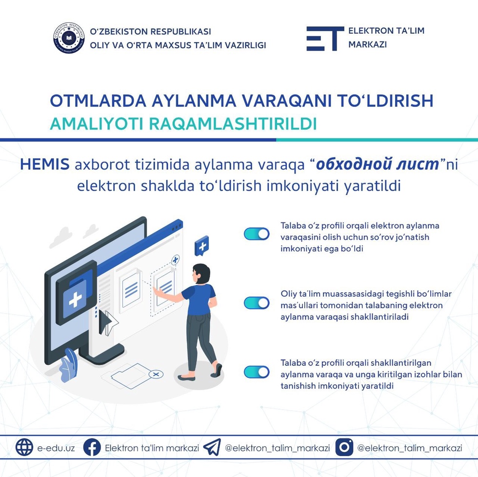Таълим муассасаларини тугатганда ёки ўқишни бир таълим муассасасидан бошқасига кўчирганда айланма варақани тўлдириш амалиёти бекор қилиниб, “ҲЕМИС” ахборот тизими орқали амалга оширилади.