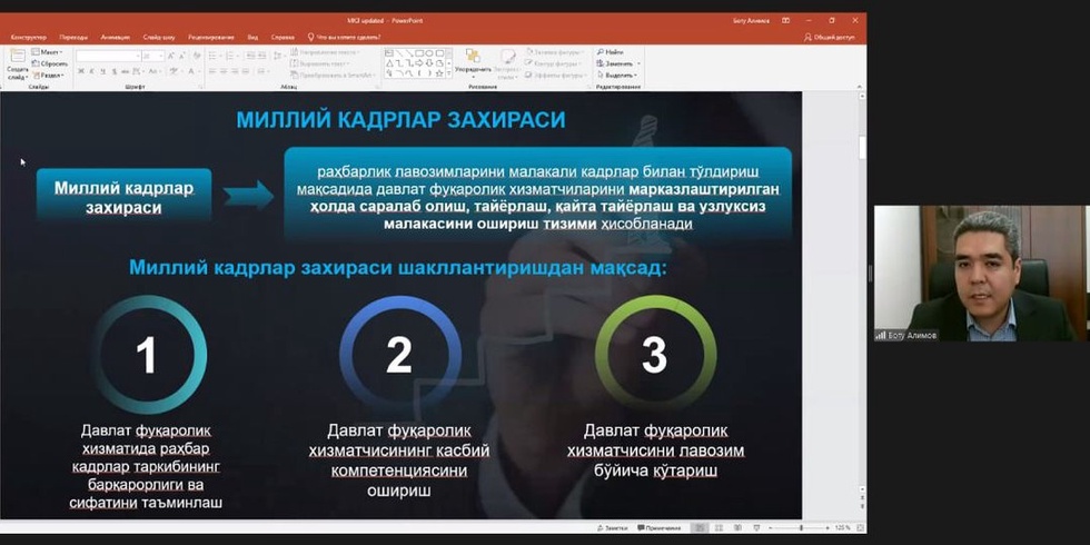 Бугун ZOOM платформаси орқали Миллий кадрлар захирасига олинган номзодлар иштирокида мулоқот ташкил этилди. Унда Президент Администрацияси ва Президент ҳузуридаги Давлат хизматини ривожлантириш агентлиги масъул раҳбарлари ҳам иштирок этди.
