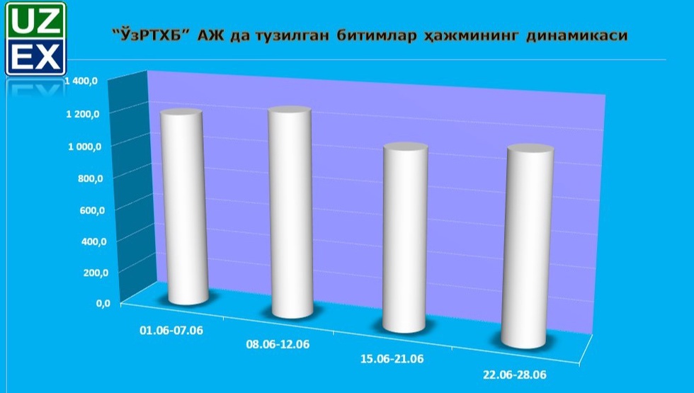 Кўриб чиқилаётган даврда очиқ биржа савдолари орқали жами 979,1 млрд сўмлик товар ресурслари сотилди, бу кўрсаткич олдинги ҳафтага нисбатан 4,9% га кўпдир. Сотувчи корхоналар маҳсулотларни тасдиқланган жадвалларга риоя қилган ҳолда биржа савдоларига қўйишди, шу жумладан: