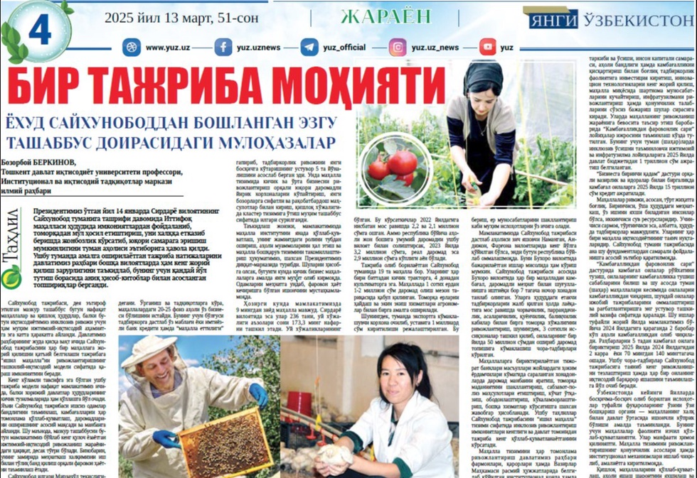 Қишлоқ маҳаллаларини қўллаб-қувватлаш, аҳоли яшаш шароитини яхшилаш ва даромадларини кўпайтиришга қаратилган ҳамда тадбиркорликка янада кенг йўл очиш учун Сайхунобод туманида ўтказилаётган агросаноат тажрибаси муносиб натижаларга етаклаётгани билан аҳамиятли.