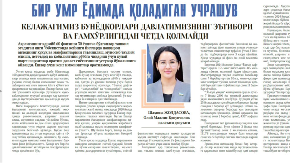 Янги таҳрирдаги Конституцияда давлат ёшларнинг интеллектуал, ижодий, жисмоний ва ахлоқий жиҳатдан шаклланиши ҳамда ривожланиши, уларнинг таълим олиш, соғлиғини сақлаш, уй-жойли бўлиш, ишга жойлашиш ва дам олиш ҳуқуқларини таъминлаш учун етарли шароит яратиши зарурлиги белгилаб қўйилди. Бугун Бош қонунимизда акс этган нормалар ҳаётга тўлиқ татбиқ қилинмоқда. Асосийси, бу имкониятлардан мамлакатимиз ёшларининг барчаси фаол фойдаланяпти. Ҳозир ҳеч бир ёш давлатимизнинг эътибори ва ғамхўрлигидан четда қолаётгани йўқ.