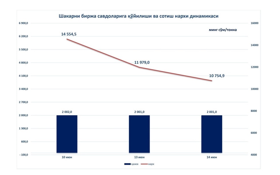 Кўриб чиқилаётган даврда биржа савдоларига жами 6 004 тонна шакар қўйилган бўлиб, улардан барча ҳажми сотилди. Бунда, биржа савдолари орқали "Хоразм шакар" МЧЖ томонидан 3 000 тонна ва "Ангрен шакар" МЧЖ томонидан 3 004 тонна шакар сотилди.