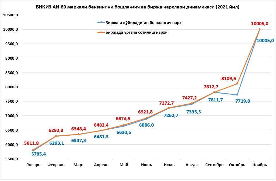 Жорий йилнинг бошидан буён АИ-80 маркали бензинининг ўртача ҳафталик котировкаси маҳсулотнинг бир тоннаси учун 5 700,2 минг сўмдан 9 302,8 минг сўмгача, яъни 63,2% га ўсган. Биржа савдоларига қўйилаётган мазкур маркали бензиннинг аксарият қисми, яъни 84% Бухоро нефтни қайта ишлаш заводи ҳиссасига тўғри келади.