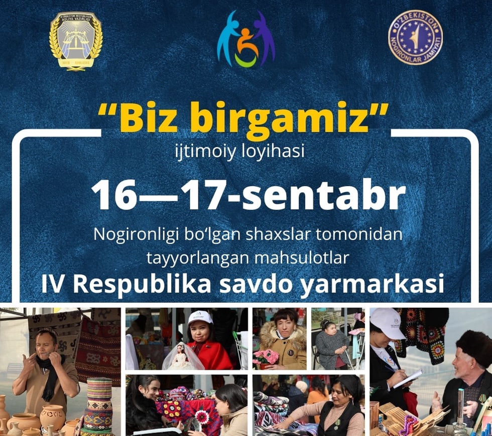 16-17 сентябрь кунлари Тошкент шаҳри, Мирзо Улуғбек тумани, Темур Малик кўчасидаги «ЕКОБОЗОР» савдо мажмуасида соат 10.00 дан 17.00 гача ногиронлиги бўлган шахслар томонидан тайёрланган маҳсулотлар ИВ Республика савдо ярмаркаси ўтказилади.