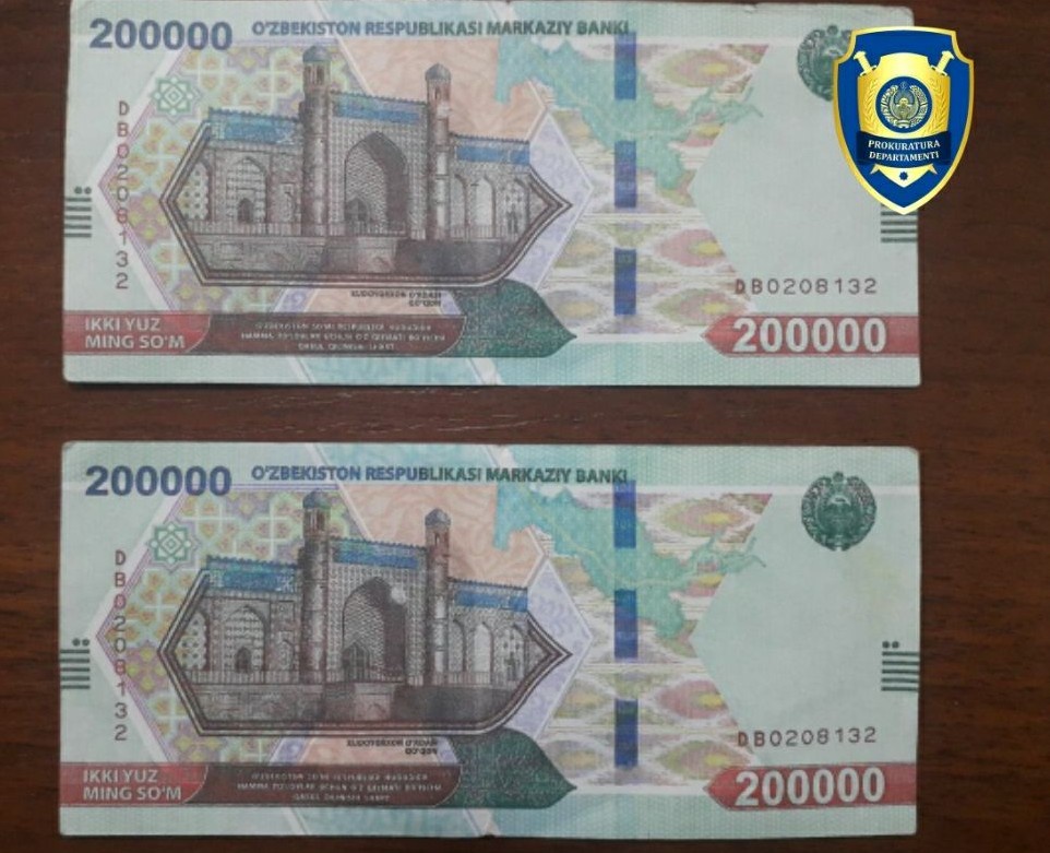 Бош прокуратура ҳузуридаги Департаментнинг Бўка туман бўлими томонидан ИИБ ходимлари билан ҳамкорликда ўтказилган терговга қадар текширувда, фуқаролар З.Э. ва К.К. туманнинг марказий кўчасида жойлашган савдо марказида амалга оширган хариди учун “Ф.С” МЧЖ сотувчиси Н.Қ.га 2 дона 200 минг сўмлик қалбаки купюраларни берганлиги аниқланган.