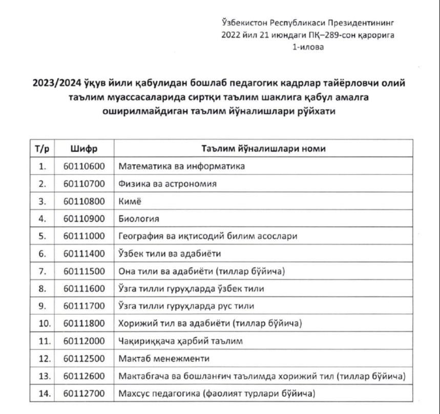 2023/2024 ўқув йили қабулидан бошлаб педагогик кадрлар тайёрловчи ОТМларининг мазкур қарорга 1-иловада кўрсатилган таълим йўналишлари бўйича сиртқи таълим шаклига қабул амалга оширилмайди. 1-иловада кўрсатилмаган педагогика соҳасидаги таълим йўналишларига сиртқи таълим шакли бўйича ўқишга таълим тизимида педагогик фаолиятга оид камида беш йиллик иш стажига эга бўлган шахслар қабул қилинади.