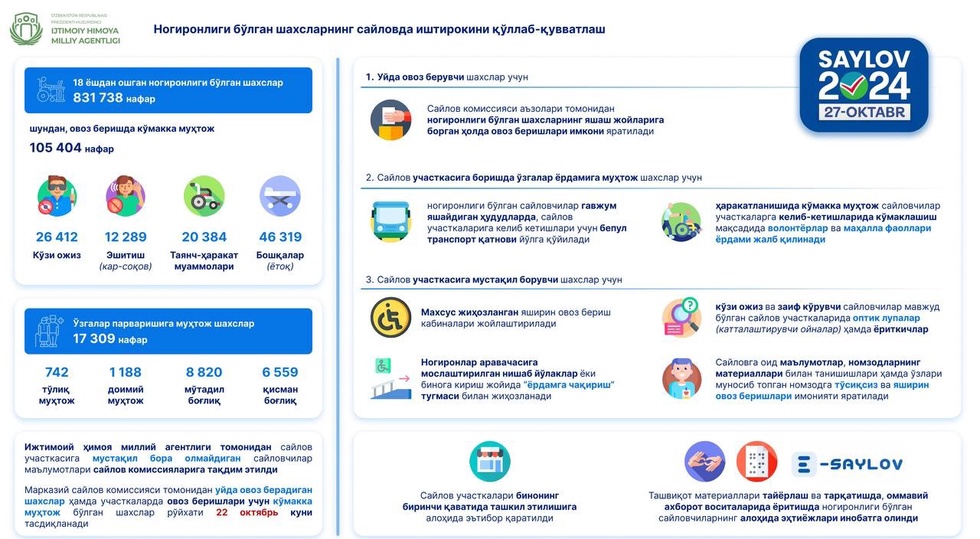 Қолаверса, Ижтимоий ҳимоя миллий агентлиги томонидан сайлов участкаларини биноларнинг биринчи қаватида жойлашганига алоҳида эътибор қаратилди.