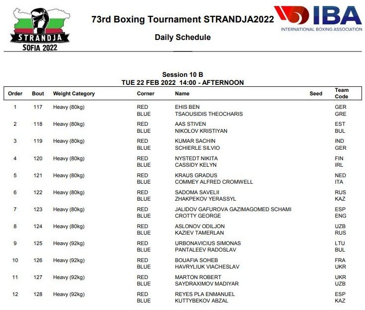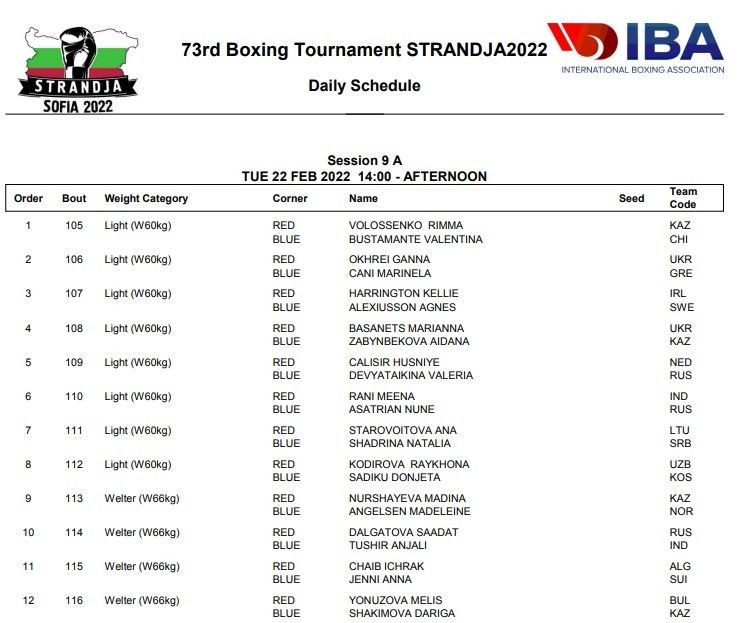 Кун давомида тўрт нафар боксчимиз рингга кўтарилади. Унда Одилжон Аслонов, Абдумалик Халаков, Мадияр Саидраҳимов ва Райҳона Қодирова каби боксчиларимиз кейинги босқич йўлланмаси учун баҳслашади.