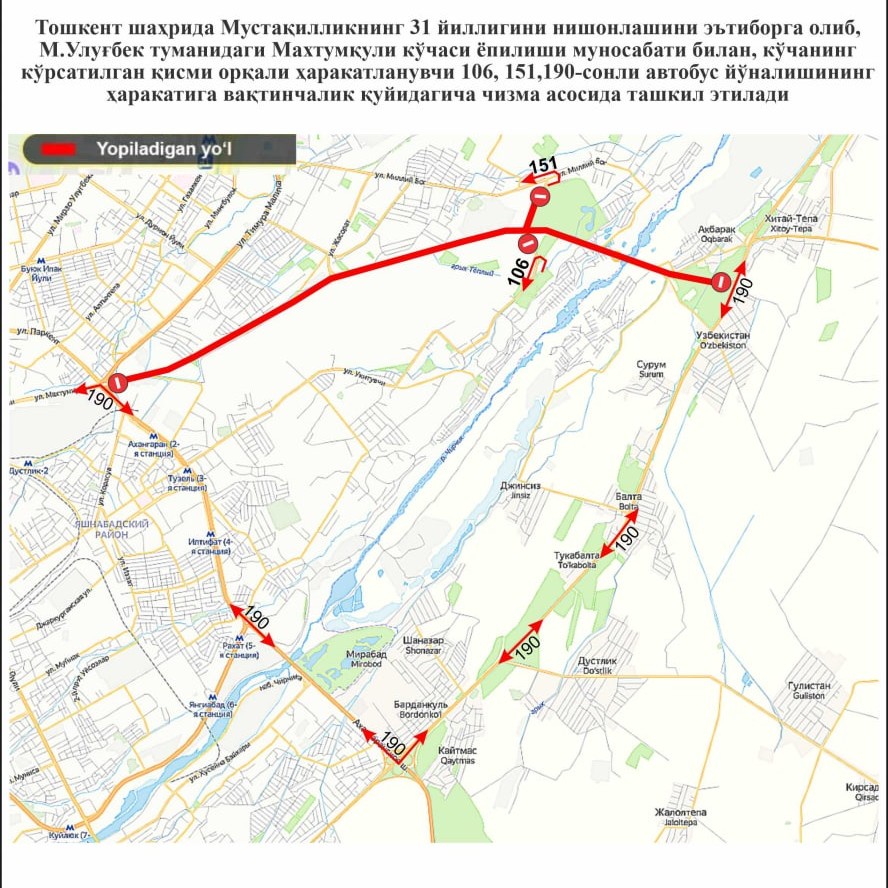Жорий йилнинг 31 август куни Ўзбекистон Республикаси Мустақиллигининг 31 йиллик байрам тадбири ўтказилиши муносабати билан, М.Улуғбек туманидаги Махтумқули кўчасида автотранспорт воситалари ҳаракати соат 18:00 дан 24:00 га қадар чекланади.
