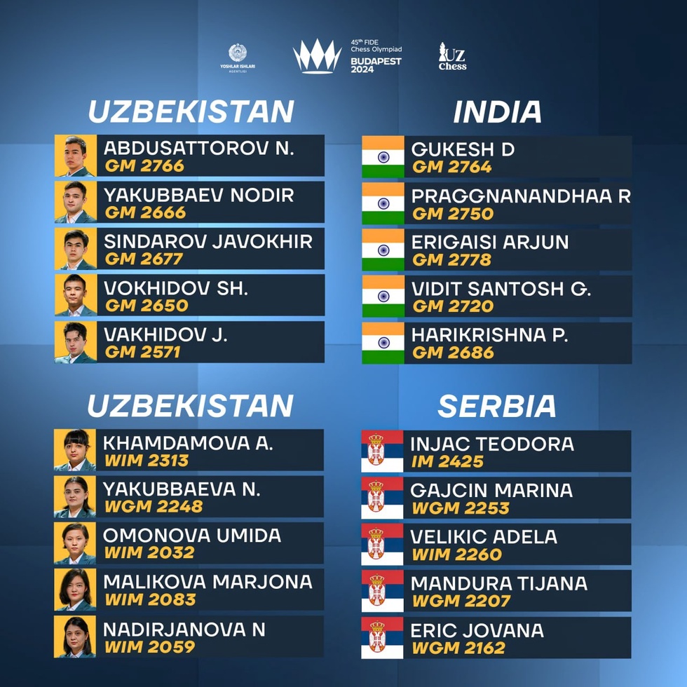 Эслатиб ўтамиз: Аввалроқ Венгриянинг Будапешт шаҳрида ўтказилаётган 45-Бутунжаҳон шахмат Олимпиадасининг 7-тур ўйинларида эркаклар терма жамоаси Украинани 3:1 ҳисобида, қизлар эса Грецияни 2,5 : 1,5 ҳисобида мағлуб этган эди.