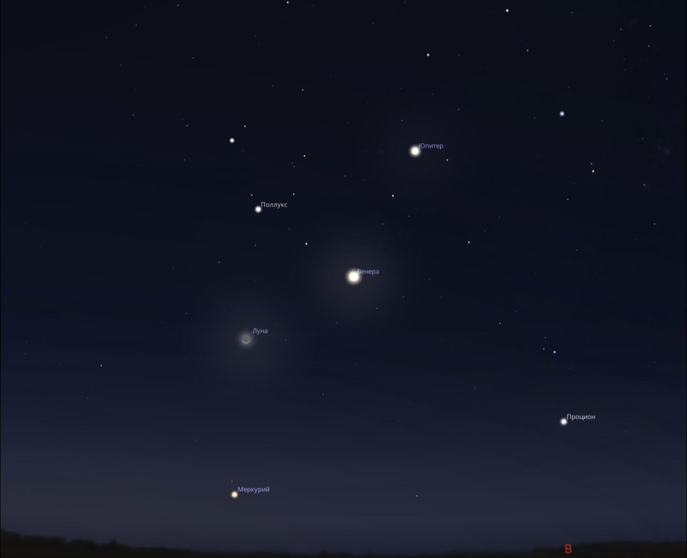 Қуёш чиқишидан 2.5 соат аввал эса жанубий-ғарбий осмонда Сатурн, шарқий осмонда эса Юпитер, Венера ва Меркурий сайёралари кўринди.