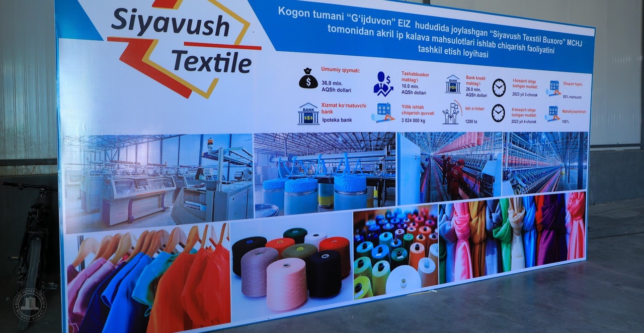 “Ғиждувон” эркин иқтисодий зонасининг Когон тумани ҳудудида “Сиёвуш Текстиль Бухоро” МЧЖ томонидан қиймати 36,0 млн. долларга тенг йилига қуввати 40,0 минг тонна акрил ип-калава маҳсулотларини ишлаб чиқариш лойиҳаси амалга оширилишига киришилган эди.