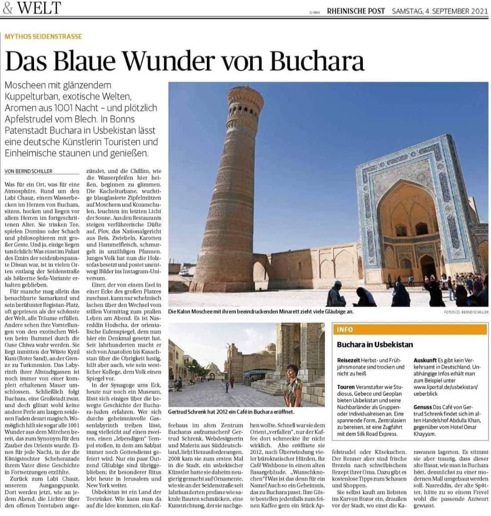 "Бухоронинг мовий мўъжизаси" деб номланган ушбу мақолада Бухоро ва бухороликлар ҳаёти, шунингдек, бу ерда ўз бизнесини бошлаган немис тадбиркор аёли Gertrud Shrenk ҳақида сўз боради.