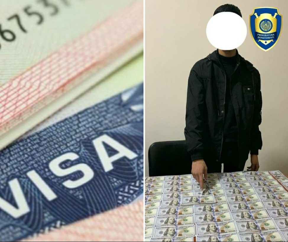 Бош прокуратура ҳузуридаги департаментнинг Юқоричирчиқ туман бўлими томонидан ДХХ ходимлари билан ҳамкорликда ўтказилган тезкор тадбирда, фуқаро Ж.О. фуқаро А.нинг ишончига кириб, гўёки Америка Қўшма Штатлари элчихонасида ишловчи танишлари орқали 30 000 АҚШ доллари эвазига унга чет давлатга чиқиш ҳуқуқини берувчи “VISA” ҳужжатларини тайёрлаб беришини айтиб, олдиндан 10 000 АҚШ долларини олган вақтида ашёвий далиллар билан ушланган.