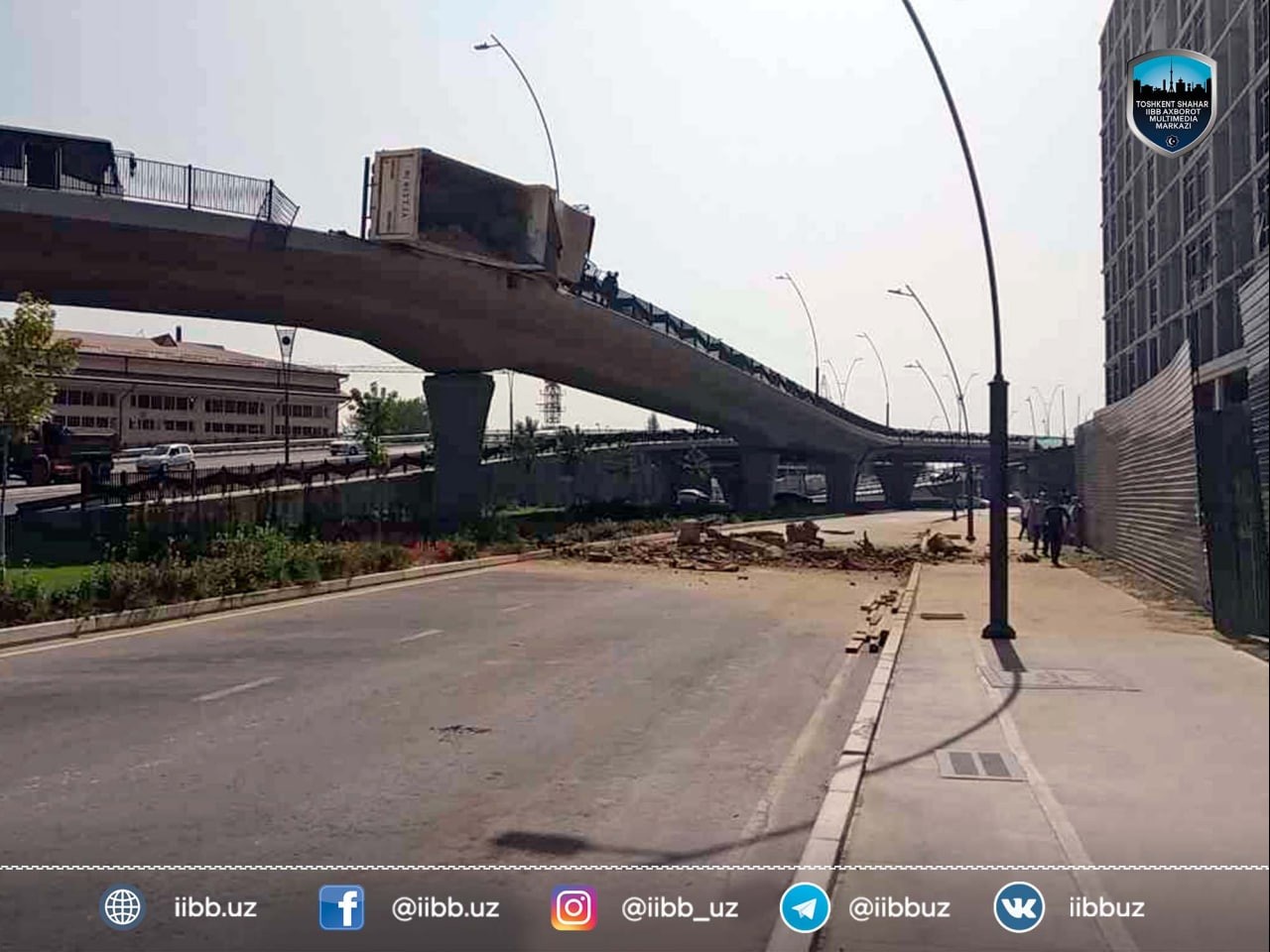 Маълум қилинишича, бугун, 20 сентябрь куни тахминан соат 10:30 ларда Яккасарой тумани КХАЙ кўчасидаги кўприк устида ҳайдовчи, 1975 йилда туғилган В.А. бошқарувидаги "HOWO ZZ3" русумли давлат рақами 01 613 TJA бўлган юк автоуловида қурилиш чиқиндиларини ортиб кетаётган вақтида кўприк устида бошқарувни йўқотиб кўприкнинг четки қисмига ағдарилган.
