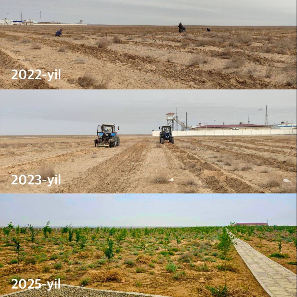 “Азия Транс Газ” қўшма корхонаси ташаббуси билан аввалига 8 гектар ерга қайрағоч, жийда ва бошқа иқлимга мос дарахт-буталар экилди. Бунинг учун мутахассислар жалб қилиниб, тупроқни "барҳаёт" қилиш учун био-ўғитлар, биогумуслардан фойдаланилди.