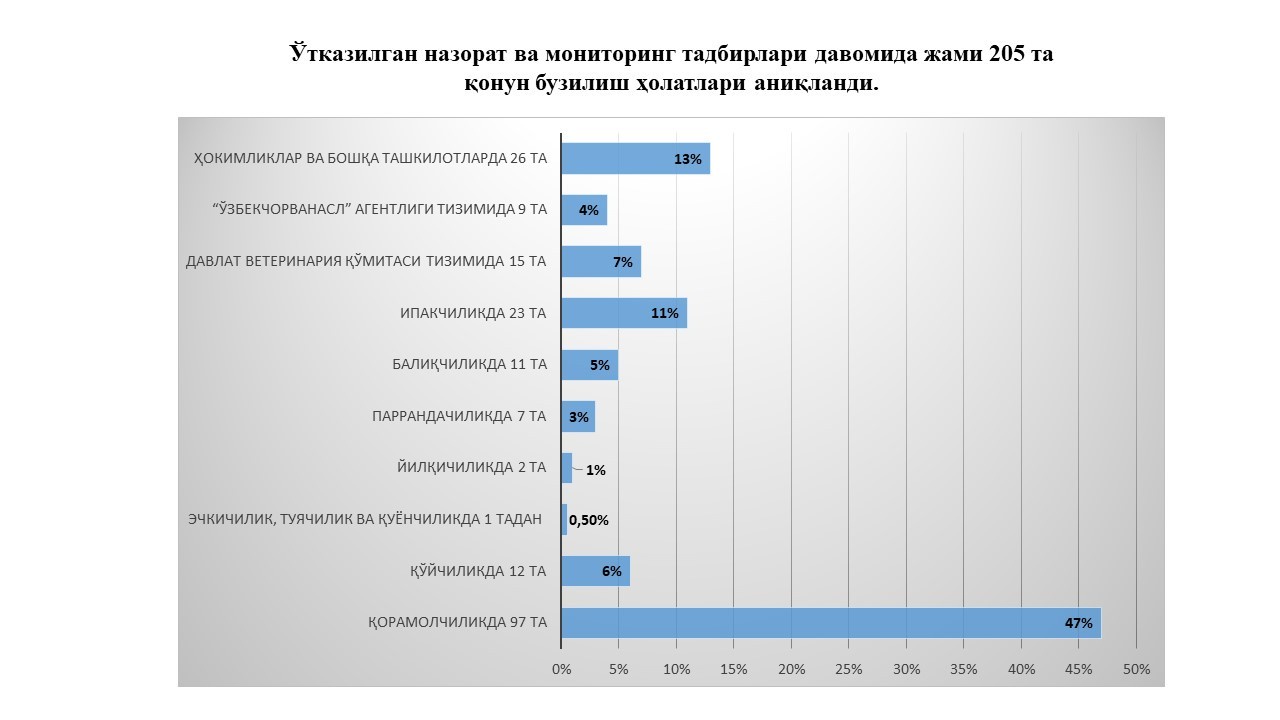 Жорий йил май ойининг биринчи ўн кунлигида “Ўзагроинспекция”нинг Чорвачиликда наслчилик ишларини назорат қилиш йўналишида жами 667 та назорат тадбирлари ўтказилди. Шундан, 608 тасини мониторинг ва 59 тасини текширишлар (шундан 37 таси хабардор қилиш тартибида) ташкил қилади.