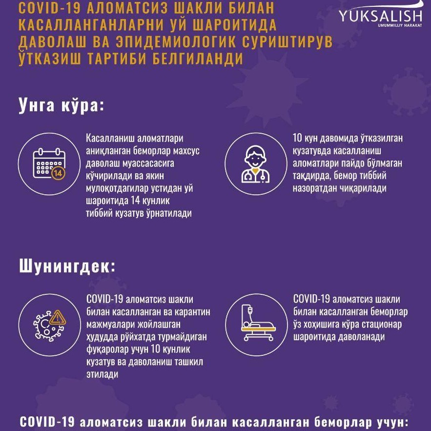 🔹2020 йил 5 июль кунидан бошлаб COVID-19 аломатсиз шакли билан касалланган беморларни белгилаб берилган схема асосида туман/шаҳарларда ташкил этилган мобил гуруҳ (СEОМ вакили, инфекционист, УАШ) томонидан саралаш ва уйда даволаш учун етарли шароит бор деб ҳисобланган фуқароларни белгиланган тартиб асосида бирламчи тиббий-санитария тизими муассасалари назоратида 10 кун давомида уй шароитида тиббий кузатуви ва даволанишини йўлга қўйиш;