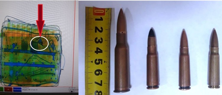 Натижада, сканер тасвирлари қўл сумкаси ичида шубҳали жисм борлигини кўрсатди. Ушбу шахснинг қўл сумкаси божхона кўригидан ўтказилганида, сумка ичида контрабанда предмети ҳисобланувчи  1 дона СВД милтиғининг ва 3 дона АКС, АК-47, АКМ русумли автоматларнинг жангавор патронлари борлиги аниқланди.