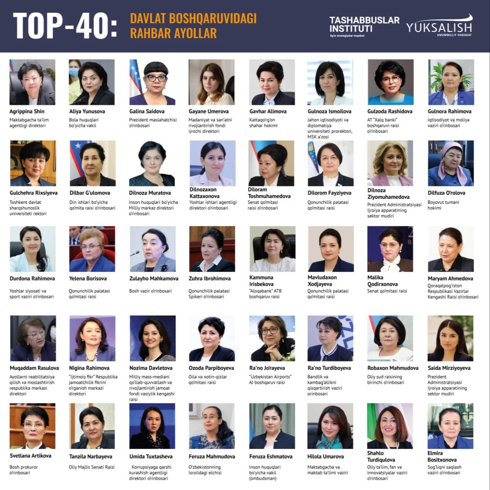 «Юксалиш» умуммиллий ҳаракати мутахассислари Ижтимоий-иқтисодий ташаббуслар институти экспертлари билан ҳамкорликда давлат тузилмалари ва ташкилотларидаги раҳбар аёллар рўйхатини янгилади.