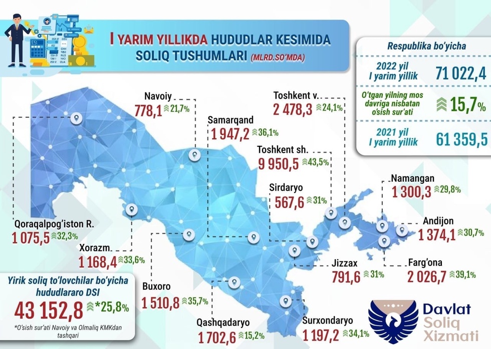 Жорий йилнинг биринчи ярмида буджетга тушган солиқ тушумлари 71 триллион сўмни ташкил этиб, бу ўтган йилнинг шу даврига (61,4 трлн сўм) нисбатан 15,7 фоизга ўсган. Бу ҳақидаги маълумотни Давлат солиқ қўмитаси эълон қилди.