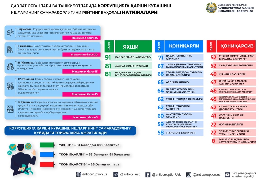 Баҳолаш натижаларига кўра Адлия, Ахборот технологиялари ва коммуникацияларини ривожлантириш, Мактабгача таълим, Транспорт вазирликлари, Давлат статистика қўмитаси, Фармацевтика тармоғини ривожлантириш, Давлат активларини бошқариш, Техник жиҳатдан тартибга солиш агентликлари, Тошкент шаҳар ва Тошкент вилоят ҳокимликларининг коррупцияга қарши курашишдаги фаолияти қониқарли деб топилди.