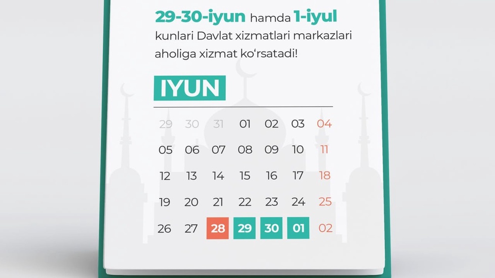 Хусусан, 29 июнь – 1 июль, яъни пайшанба – шанба кунлари Республикамизнинг барча туман (шаҳар) Давлат хизматлари марказлари соат 09:00 дан 15:00 га қадар навбатчилик асосида аҳолига хизмат кўрсатади.