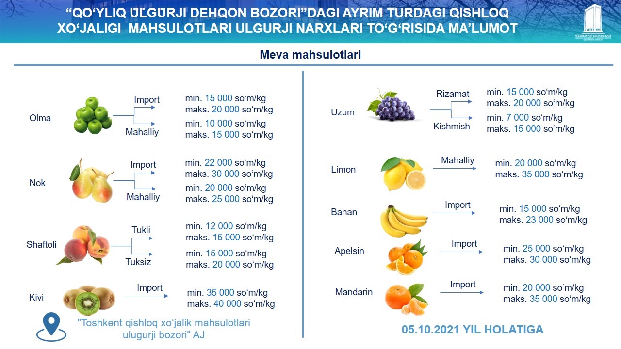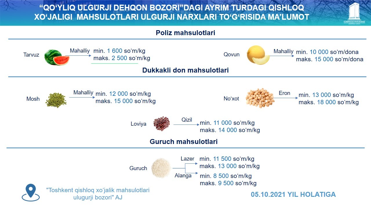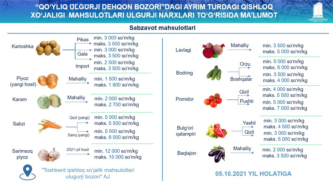 Қўйлиқ улгуржи бозорида – 25 турдаги мева, сабзавот ва полиз маҳсулотлари нархлари бўйича маълумотлар эрталаб соат 5:00 дан 7:00 га қадар; Чорсу бозорида – мол ва қўй гўшти нархлари бўйича маълумотлар эрталаб соат 5:00 ва 8:00 оралиғида йиғилади.