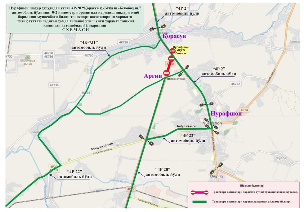 Жумладан, Нурафшон шаҳар ҳокимининг фармойишига асосан эртага, 23 апрель куни 4Р-20 – “Қорасув – Бўка – Бекобод” автомобиль йўлининг 0-2 километрлари оралиғида транспорт воситалари ҳаракати тўлиқ тўхтатилади.