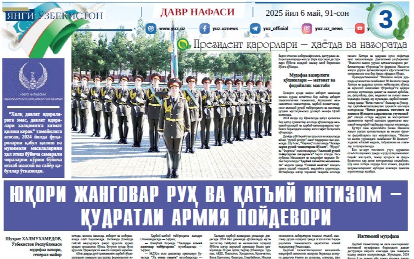 Бир сўз билан айтганда, замонавий ўзбек армияси сафлари миллий қадриятларимизни ўз фаолиятига чуқур сингдира олган, халқ хизматига виждонан бел боғлаган, Ватан тинчлигини ўз ҳаётидан устун қўювчи довюрак ўғлонлар билан бойимоқда. Қонун, ижро ва натижадорлик