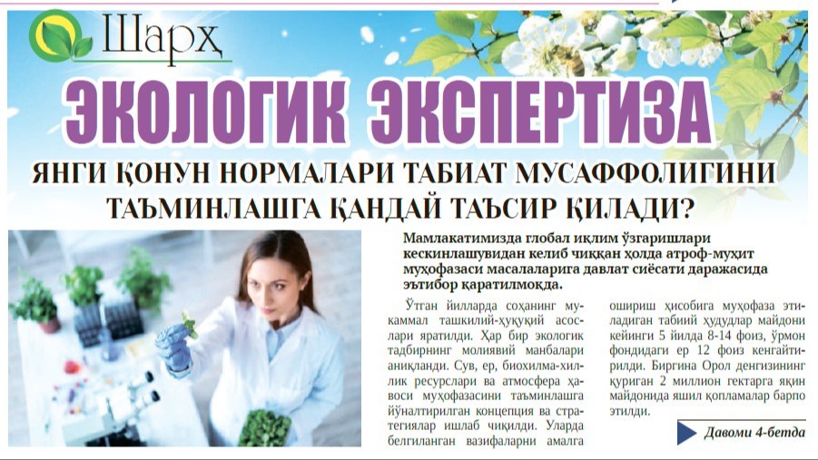 Мамлакатимизда глобал иқлим ўзгаришлари кескинлашувидан келиб чиққан ҳолда атроф-муҳит муҳофазаси масалаларига давлат сиёсати даражасида эътибор қаратилмоқда.