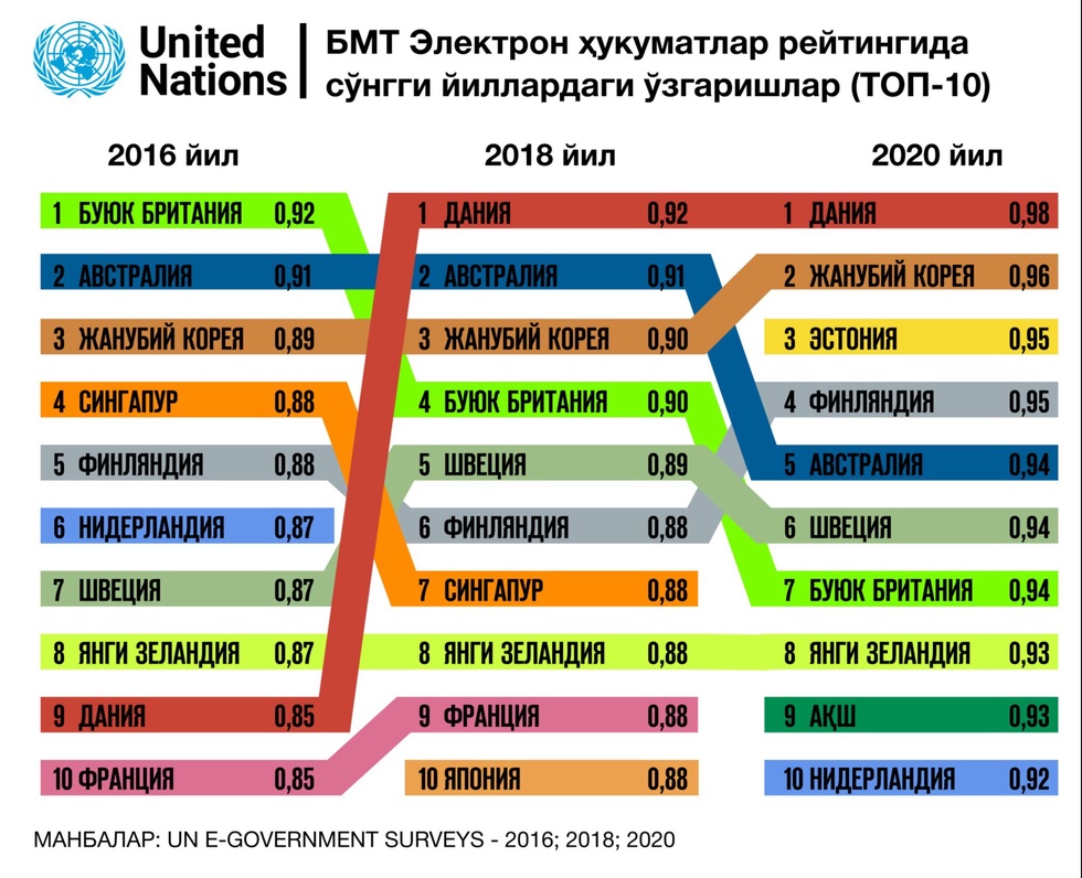 Графикадан кўриниб турибдики, топ-10 га кирган мамлакатлар иқтисодиёти юқори тараққий этган ва асосан Европа мамлакатлари. Сўнгги уч рейтинг солиштирилганда, биринчи навбатда кўзга ташланадигани, охирги йилларда етакчи бўлиб келган Буюк Британия ва Дания ўзаро ўрин алмашиши. Бу жараён Британия электрон ҳукуматни ривожлантиришда оқсашни бошлаганини эмас, балки Дания ўта юқори тезликда ривожланаётганини кўрсатади. Чунки Буюк Британия 2016 йилда 0,92 кўрсаткич билан 1-ўринда эди, 2020 йилда индекси 0,94 гача ўсганига қарамай, Қўшма Қироллик БМТ рейтингида 7-ўринга тушиб кетди. Индекс ўсишига қарамай, Австралия ва Сингапурдаги пасайишлар ёки Янги Зеландиянинг бир жойда «қотиб қолиши»га ҳам сабаб шу.