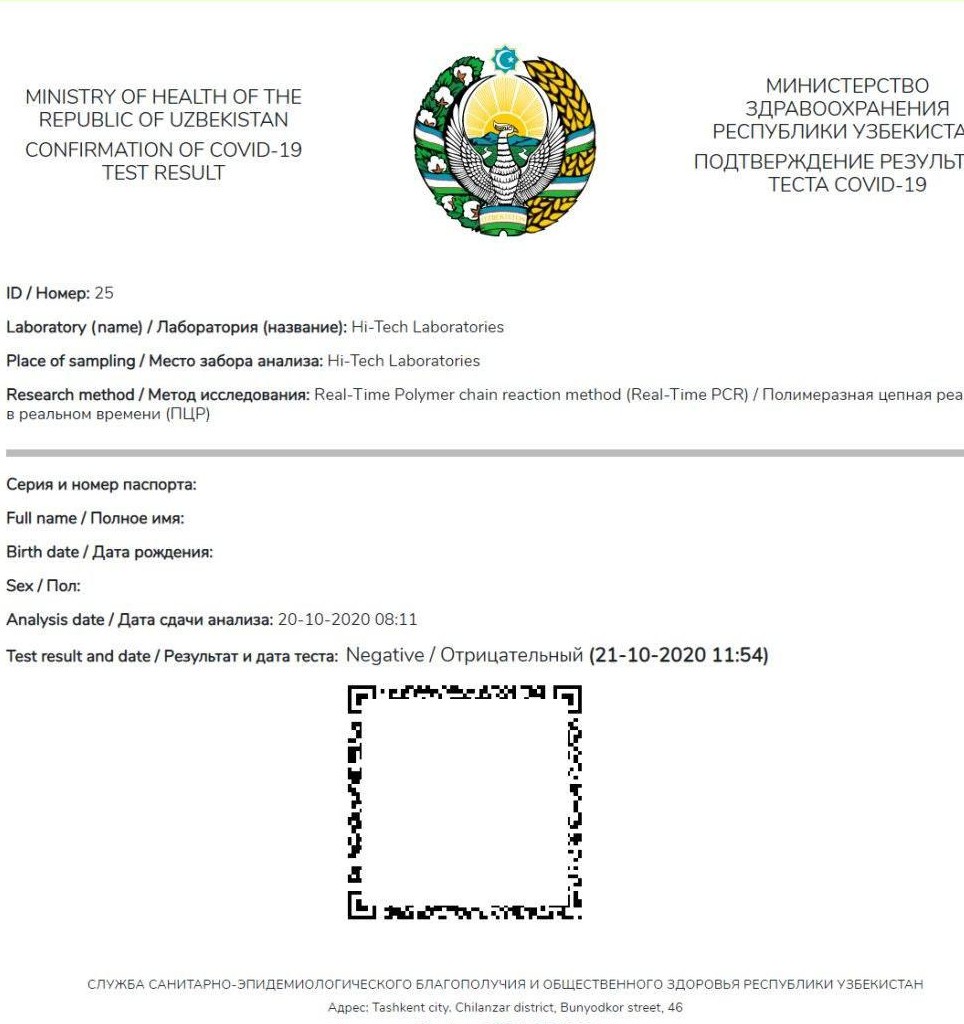 "COVID-19"га ПЗР тести натижаларини тасдиқлаш учун берилган ушбу расмий шаклда электрон тарзда ўқиладиган QR-код мавжуд бўлиб, у "COVID-19" учун ПЗР тести натижалари тақдим этиш зарур бўлган жойлардан (масалан, аэропортларда) ўтишни анча тезлаштиради.