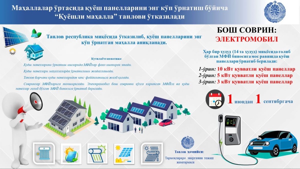 3-ўрин – қуввати 150 кВтдан кам бўлмаган қуёш панелларини биринчилардан бўлиб ўрнатган ҳамда ҳудудий электр тармоғига уланиб, ишлаб турган маҳалла (қишлоқ, овул) фуқаролари йиғинлари орасидан.