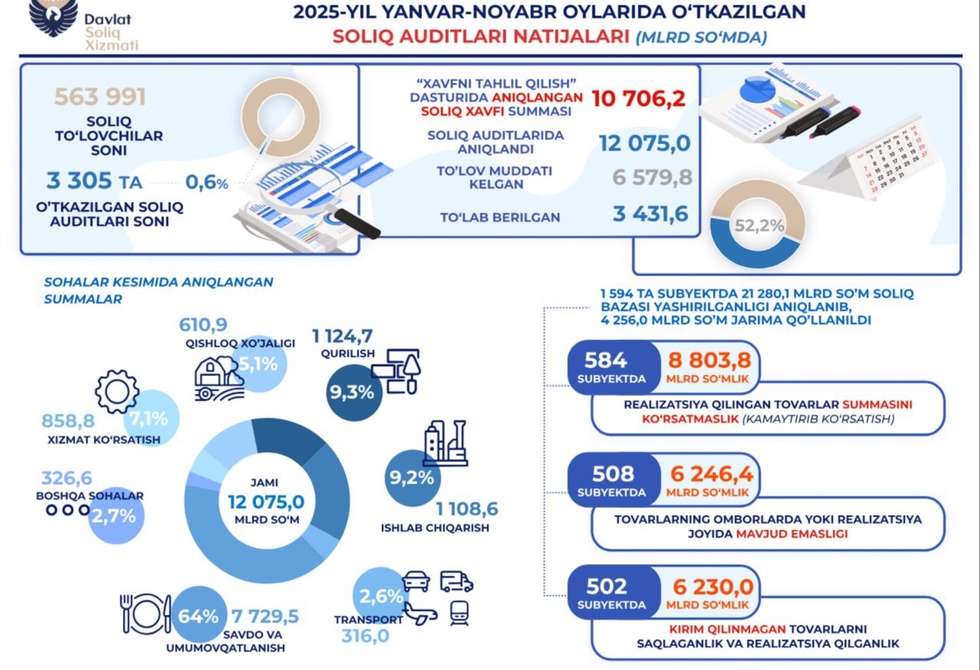 2025 йилнинг январ–ноябрь ойларида давлат солиқ хизмати органлари томонидан солиқ тўламаслик хавфи юқори бўлган 3 305 та тадбиркорлик субъектида солиқ аудити ўтказилди. Бу мазкур даврда фаолият кўрсатган жами 563,9 мингта солиқ тўловчининг 0,6 фоизини ташкил этади.