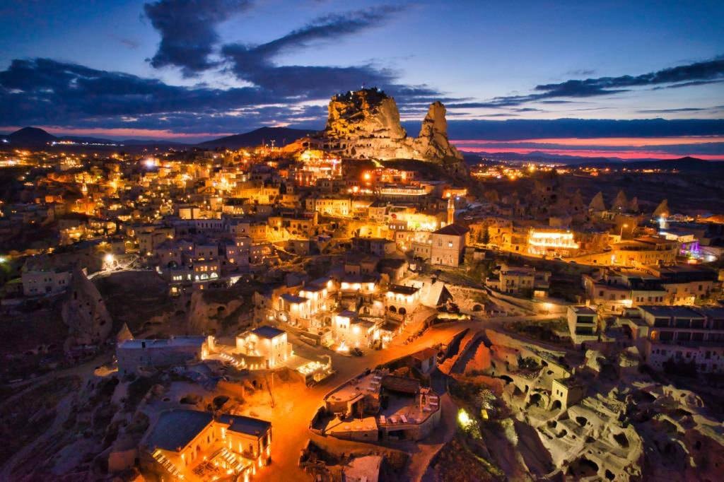 Эртаклар юрти Каппадокия тунда бутунлай бошқача қиёфага киради. Енгил ёритилган водийлар ва рамзий пери бажалари юлдузлар билан қопланган осмон остида сокин оқшом сайрлари учун замин яратади. Деринкую, Каймакли ва Ўзконак ер ости шаҳарларига соат 21:00 гача кириш мумкин. Кўплаб одамлар учун эса энг зўр тажриба тонг отишидан аввал бошланади. Осмон зулматга чўккан пайтда ўнлаб ҳаво шарларининг аста-секин шиширилиши, ҳавога кўтарилиши ва пери бажалари устидан сузиб ўтиб, осмон узра балет намойиши такрорланмас таассуротдир. Мичелин қўлланмасидаги Туркиянинг энг янги манзили сифатида эътироф этилган Каппадокиянинг мазали кечки таомларидан татиб кўринг. Шунингдек, ғор меҳмонхонасида дам олиб, маҳаллий чойларидан юдумлаб, кечани чинакам Каппадокия услубида якунлашга нима етсин!!!