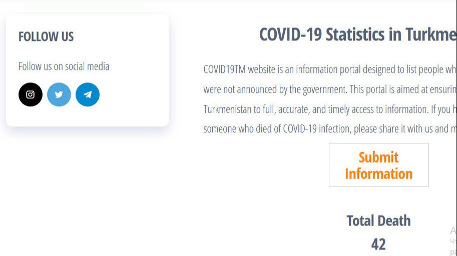 Туркманистонлик бир гуруҳ фаоллар мамлакатда COVID-19 қурбонлари тўғрисидаги маълумотларни ўз ичига олган веб-сайт яратди ва аҳолига иложи борича кўпроқ маълумот беришга ҳаракат қилмоқда. Туркман фаоллари веб-сайтда мамлакатда коронавирусдан вафот этганлар сони, уларнинг исмлари, ёшлари, манзиллари ва бошқа тафсилотлар бўйича норасмий статистик маълумотларни нашр этиб боради, дея хабар беради CentralAsia.