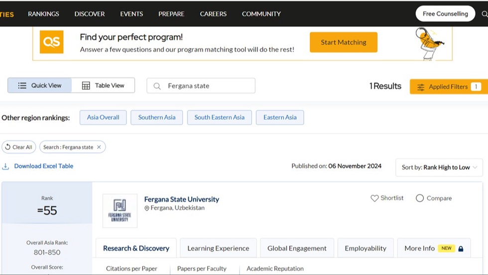 Натижаларга кўра, Фарғона давлат университети ушбу катта нуфузга эга дунё рейтингида 801-850-ўриндан жой олди.