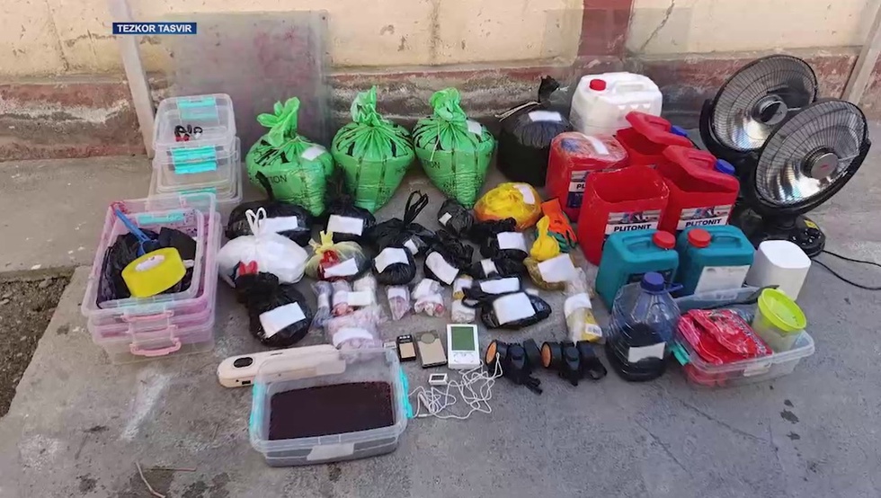 Кўздан кечириш давомида, ушбу манзилдан 8 кг. 185 гр. Альфа-ПВП, 4 кг. 209 гр. “Спайс”, 427 гр. “Мефедрон” синтетик наркотик моддалар ҳамда уларни тайёрлашда керак бўладиган 12 кг. 326 гр. махсус суюқлик ва 13 кг. 925 гр. тамаки маҳсулотлари ашёвий далил сифатида олинди.