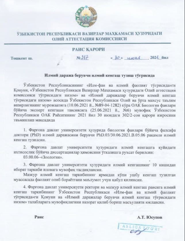 Айтиб ўтиш жоизки, Фарғона водийсида ўтказилган гидробиологик тадқиқотлар 1 докторлик (А.Мухаммадиев, 1958), энтомология соҳасида 7 докторлик (Дубовский, 1967; А.А.Мухамедиев, 1989; А.Кан, 1994; М.Ҳ.Аҳмедов, 1995; А.Г.Кожевникова, 2000; И.И.Зокиров, 2019; А.К.Хусанов, 2020) диссертацияларига замин вазифасини ўтади. Қайд этилган ва бошқа йўналишларга хос водий материаллари асосида элликдан ортиқ монографиялар чоп этилди, 50 га яқин номзодлик диссертациялари ҳимоя қилинди, мингдан ортиқ мақолалар эълон қилинди.