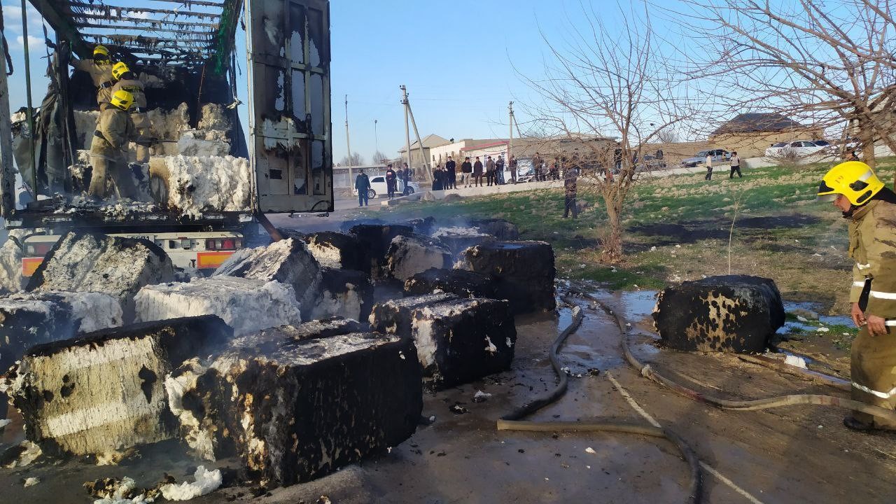 Юк автомобилига ортилган пахта ёниб кетган. Ҳодиса жойига зудлик билан ҳудудий ФВВ ёнғин-қутқарув экипажлари етиб келган.
