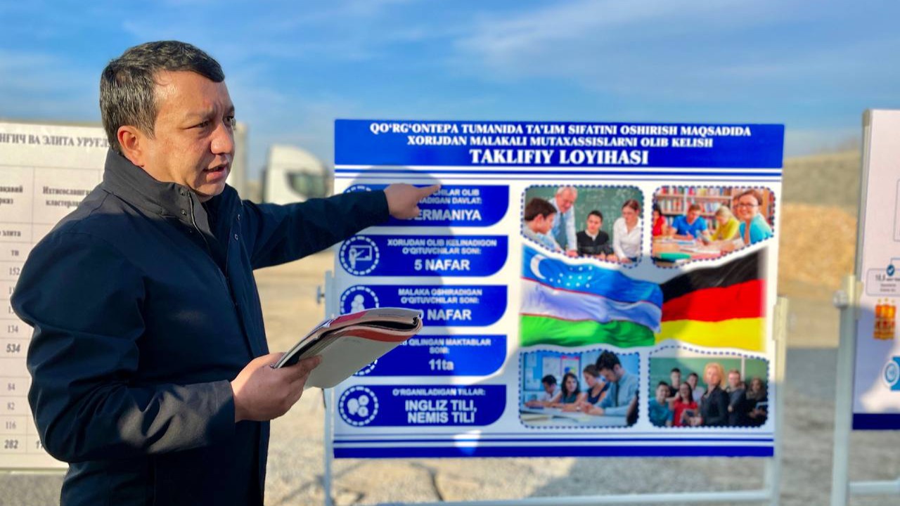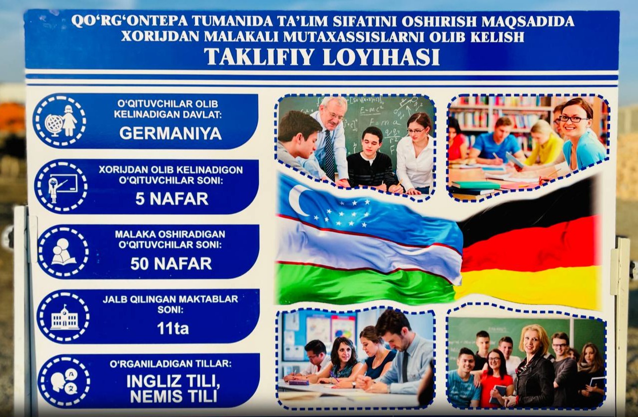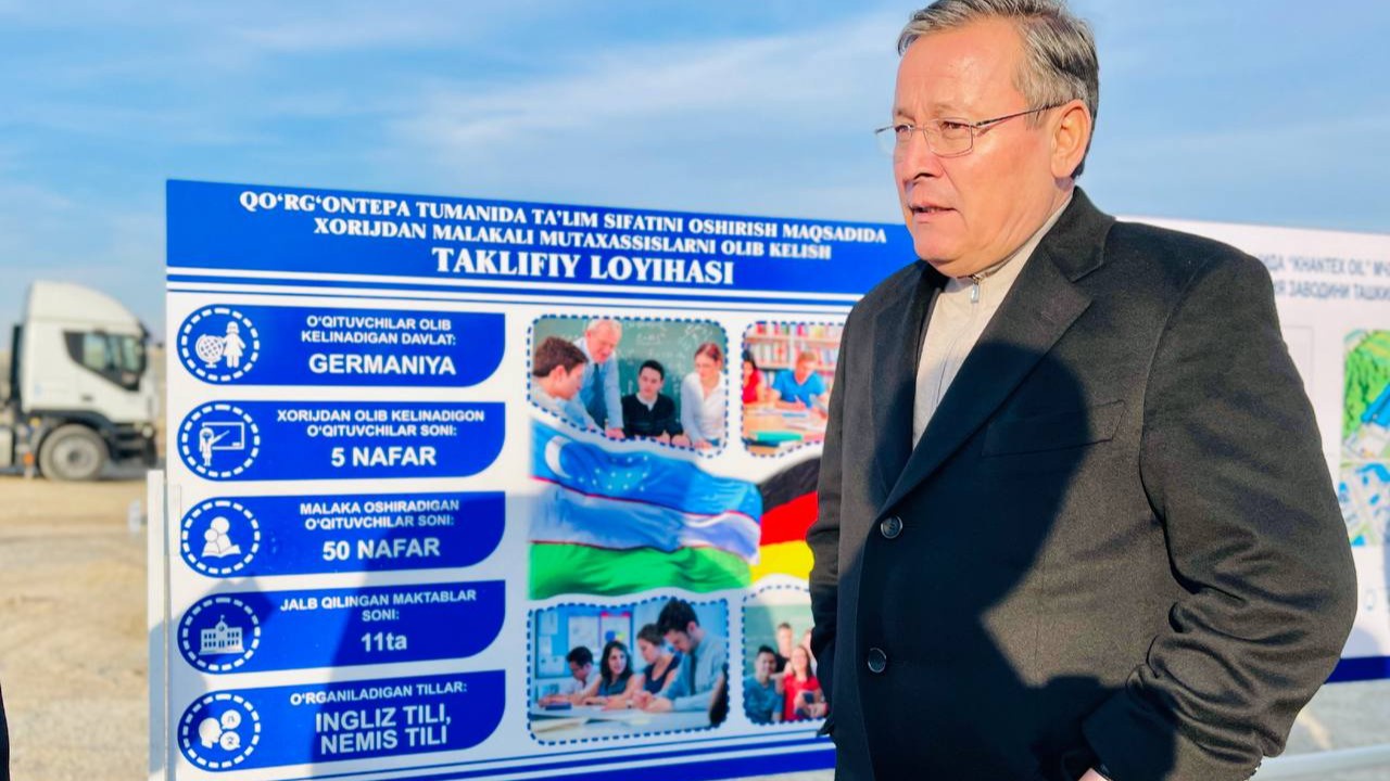 Андижон вилоятининг Қўрғонтепа тумани ҳокими Элёрбек Набижонов туманда кўплаб янги лойиҳалар қатори мактаблардаги таълим сифатини, айниқса, ўқувчиларнинг хорижий тилларни ўзлаштириш даражасини ошириш бўйича ўзига хос тажрибани йўлга қўйди. У Германиядан малакали ўқитувчиларни туманга таклиф этиш лойиҳасини ишлаб чиққан. Унга кўра, таклиф этилган 5 нафар тажрибали педагогнинг бири — мюнхенлик, 40 йиллик педагогик тажрибага эга Йорг Астер бу йил февраль ойида Қўрғонтепага етиб келди.